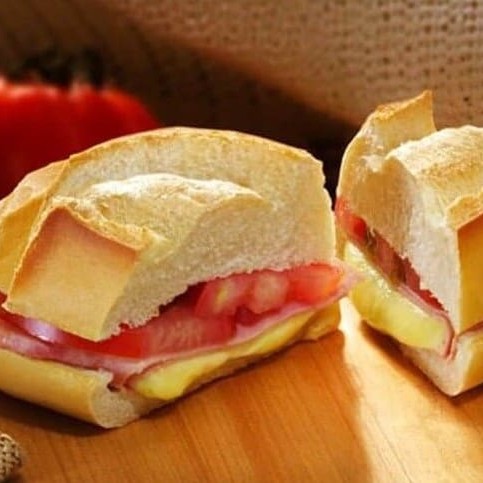 Tradicional e saboroso bauru acompanhado de fatias finas e frescas de tomate. Presunto + queijo e tomate.