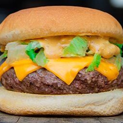 Delicioso hamburger 120g, queijo derretido na hora, salada completa no divino pão de hamburger de fabricação própria.