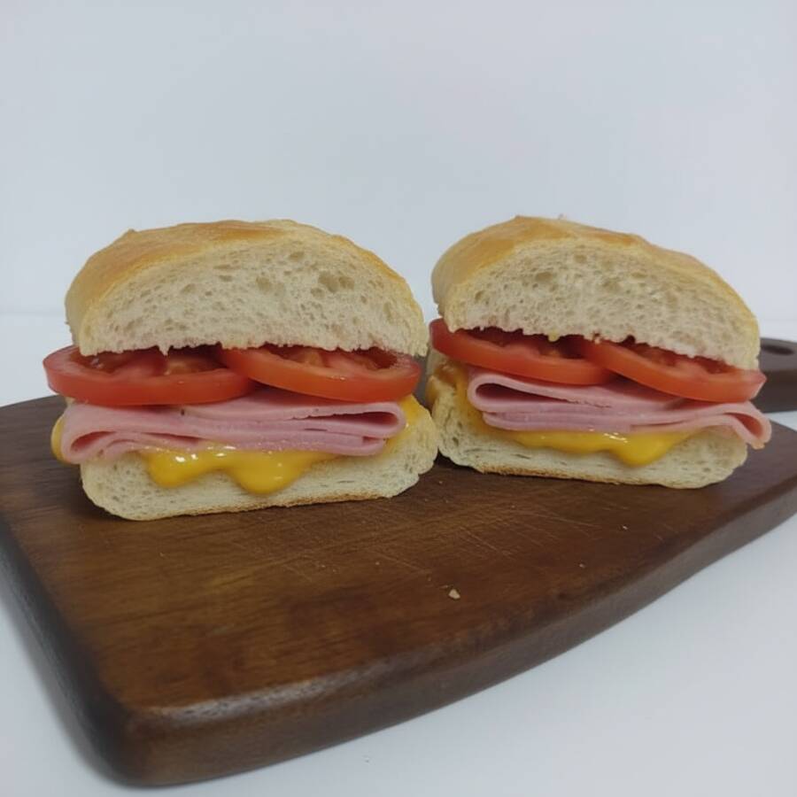 Pão francês assado no forno a lenha, presunto, queijo, bacon e ovo!