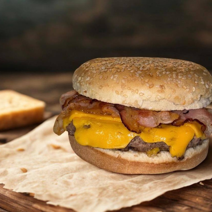 Hambúrguer artesanal 160g, cheddar cremoso e bacon crocante.