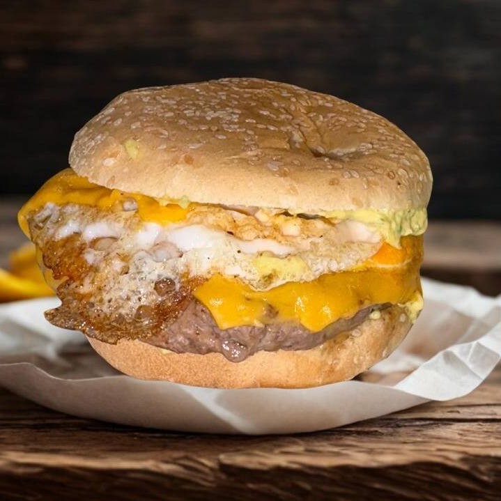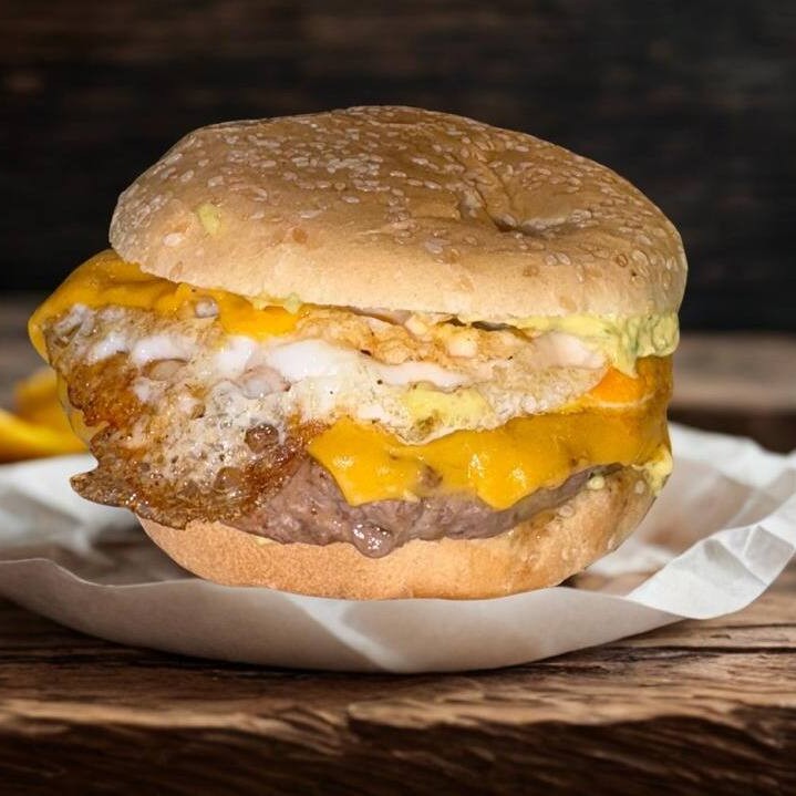 Hambúrguer artesanal 160g, ovo, cheddar cremoso e maionese verde especial.
