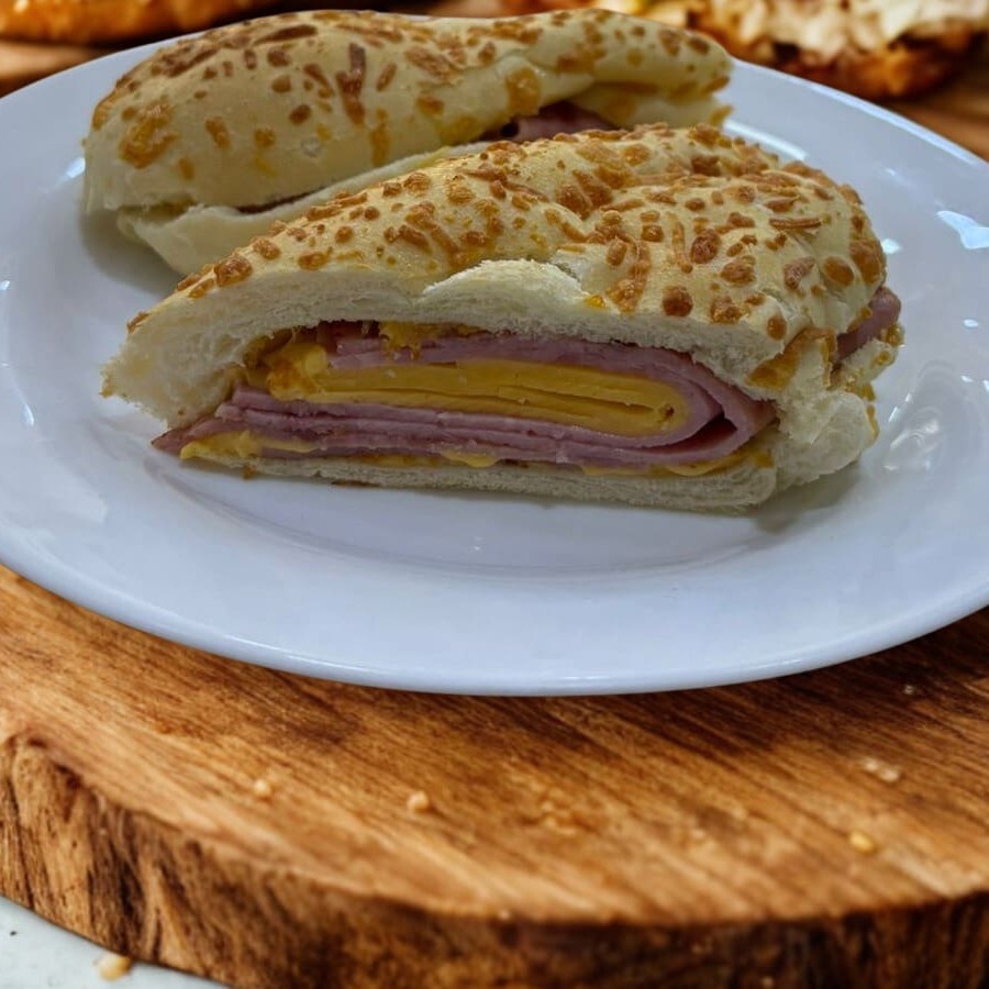 Baguete recheada de presunto e queijo.