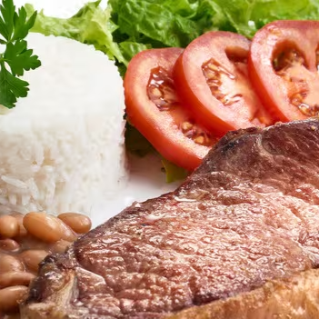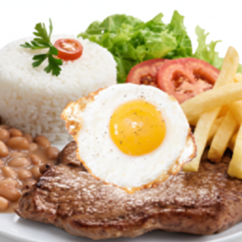 Arroz, feijão, batata frita, contra filé, alface e tomate.