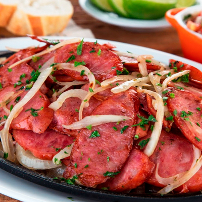 Calabresa acebolada, servida quentinha e bem temperada. Clássico das porções.