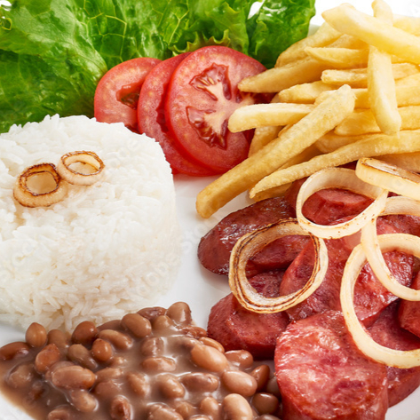 Arroz, feijão, batata frita, linguiça, ovo, alface e tomate.