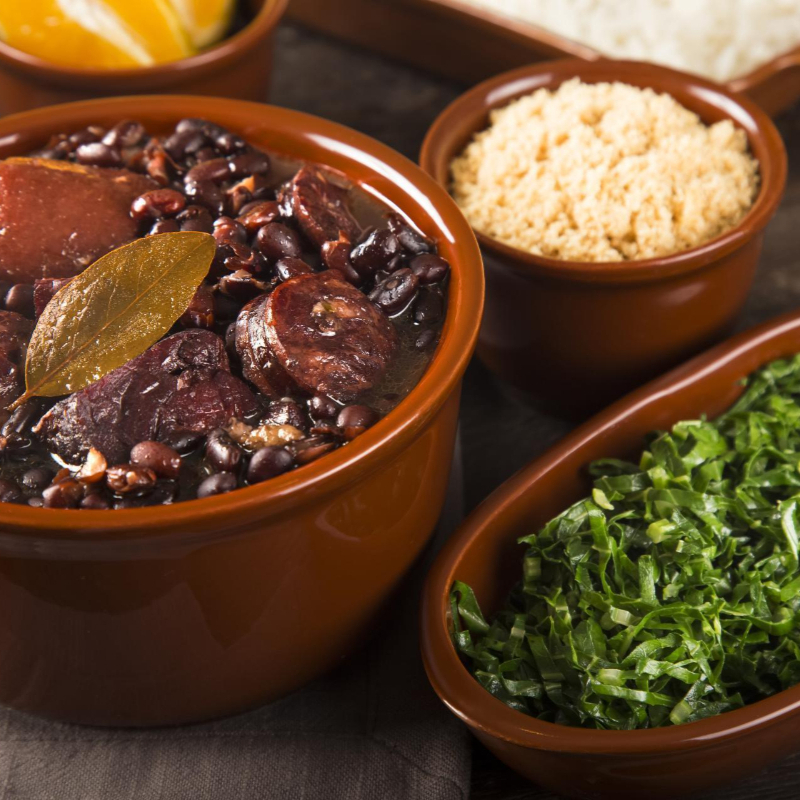 Acompanha arroz, bisteca suína, couve refogada e torresmo.