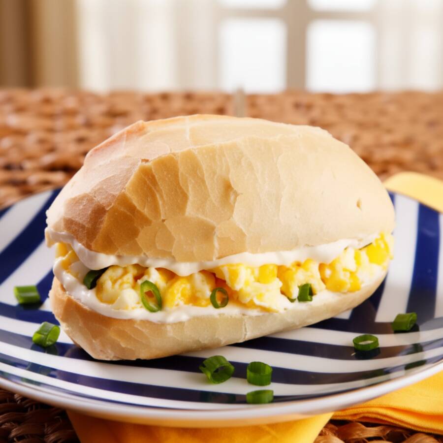 Pão francês saboroso e crocante recheado com ovos mexidos