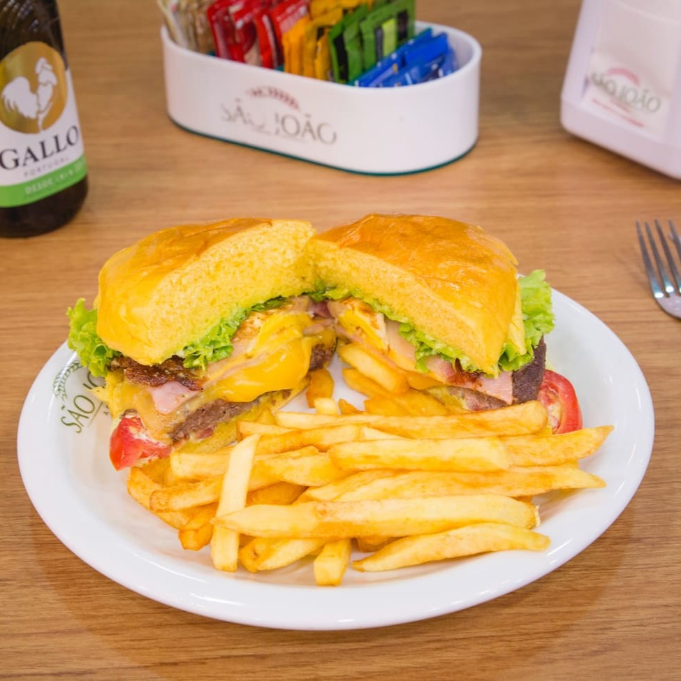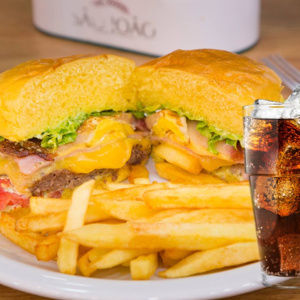 Um suculento, delicioso e irresistível hambúrguer grelhado com queijo derretido, alface, tomate e maionese, acompanhado de uma porção de batatas fritas crocantes e uma Coca-Cola geladinha de 350ml.