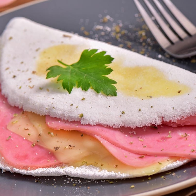 Sua textura leve e sua casquinha suave, com seu formato dobrado e recheável.