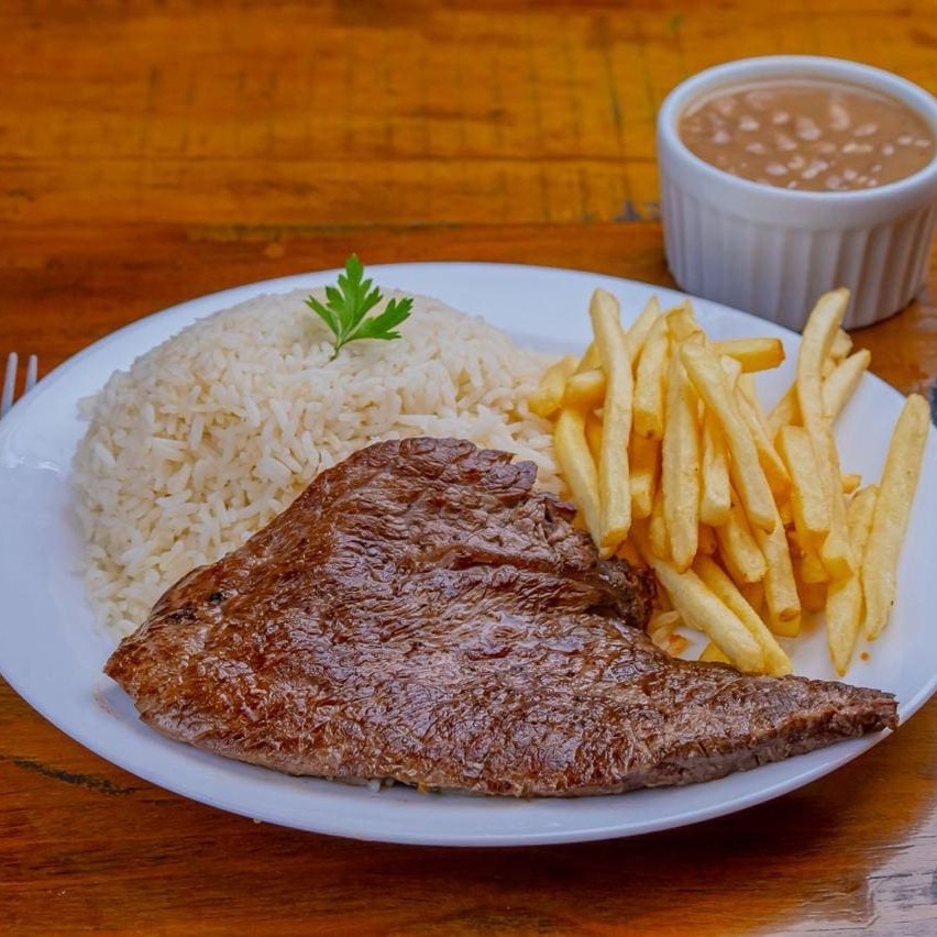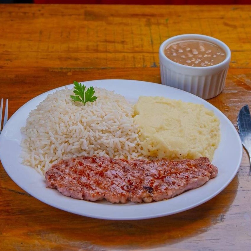 Contra Filé gralhado, arroz branco e feijão carioca. Podendo escolher um dos acompanhamentos: batata frita, farofa, salada ou vinagrete.