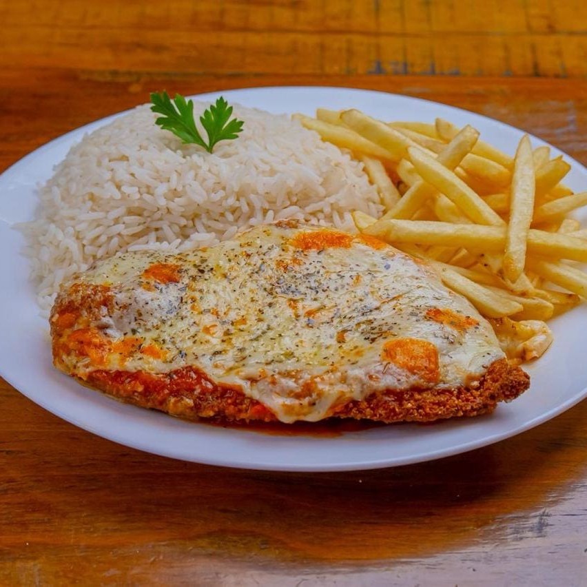 Filé de frango à parmegiana, arroz e fritas.