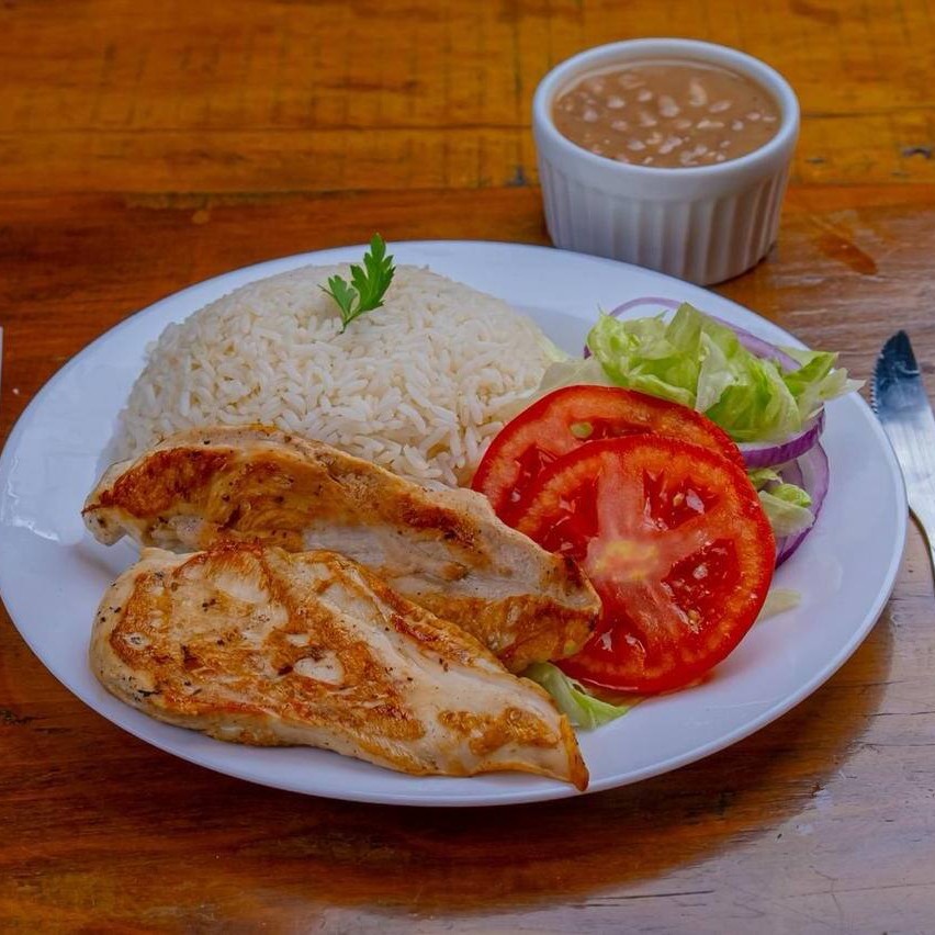 Arroz Branco, Feijão Carioca , Filé de frango grelhado podendo escolher um dos acompanhamentos: batata frita, salada, farofa ou vinagrete.
