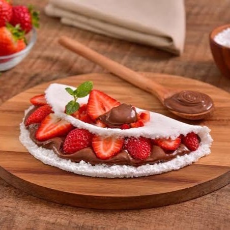 Tapioca recheada de morangos fresquinhos com creme de avelã Nutella.