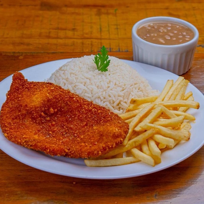 Filé de frango à milanesa, arroz branco, feijão carioca podendo escolher um dos acompanhamentos: batata frita, salada, farofa ou vinagrete.