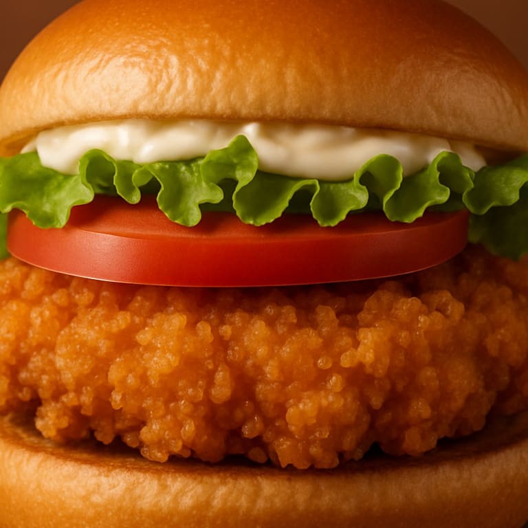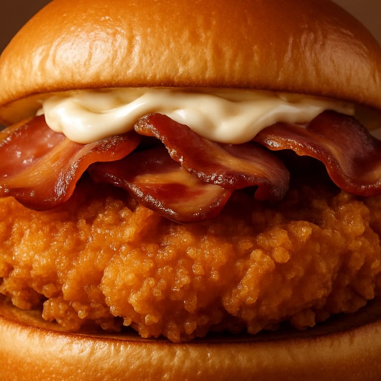 Pão de hambúrguer artesanal, hambúrguer frango empanado, queijo prato, fatias de bacon e maionese.