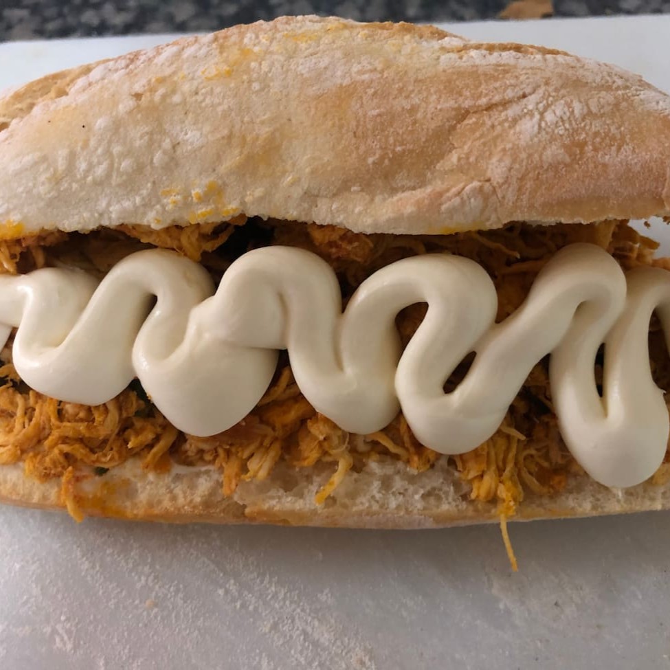 Pão de hambúrguer artesanal, hambúrguer de frango empanado, queijo prato , alface, tomate e maionese.