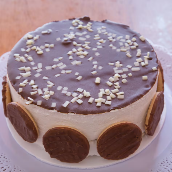 Feita com base amanteigada e creme delicado, é finalizada com uma generosa camada de chocolate e biscoitos decorativos. Uma sobremesa tradicional, com sabor sofisticado e textura cremosa.