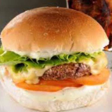 Hambúrguer 90grs, queijo prato, maionese, pão de hambúrguer.
