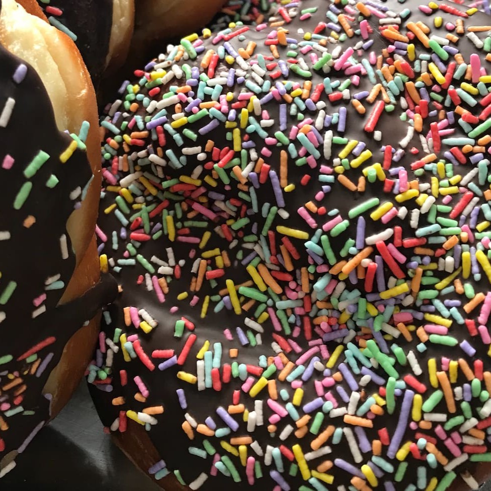 Rosquinha com cobertura de chocolate e granulado colorido.