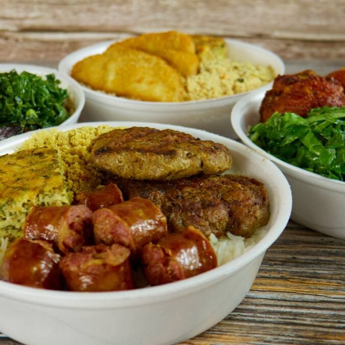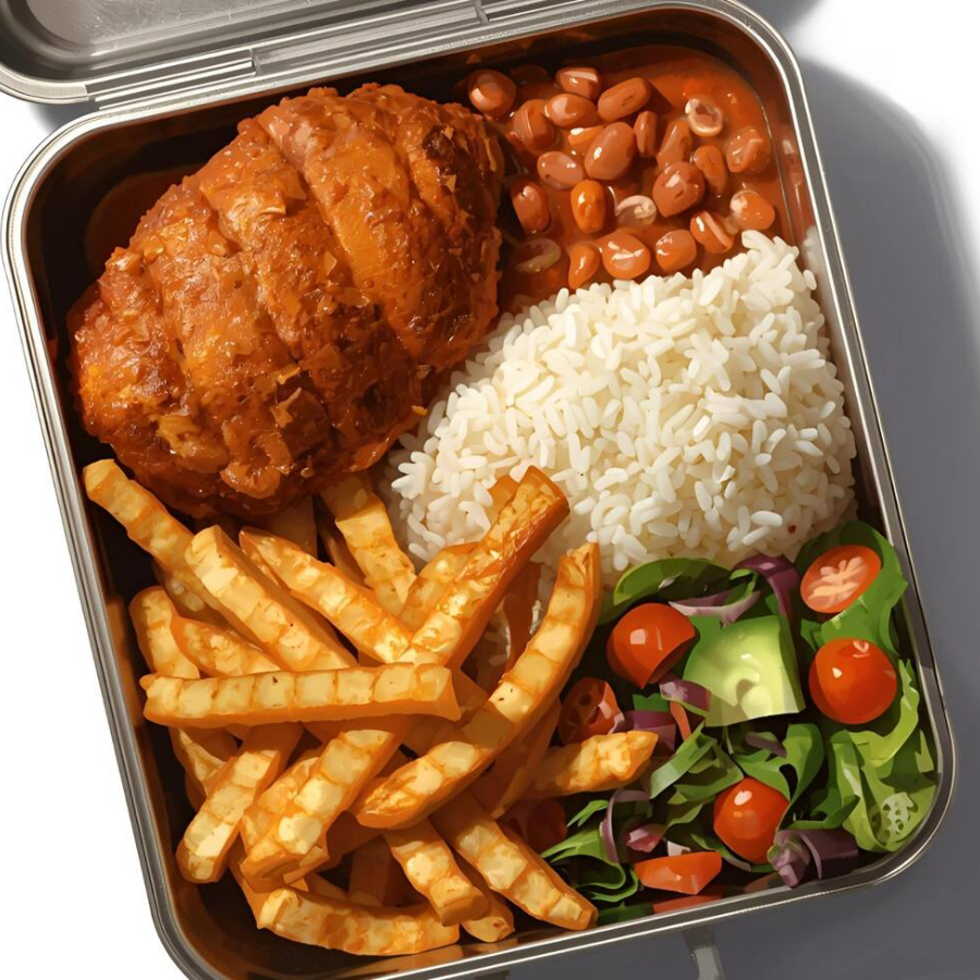 Uma refeição completa e caseira! Inclui filé de frango grelhado, arroz soltinho, feijão, farofa crocante, fritas douradas e salada fresca. Praticidade e sabor para o seu Dia a Dia.