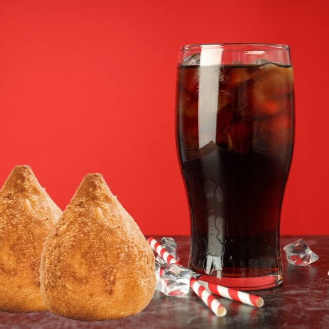 02 deliciosas coxinhas recheadas generosamente com frango, acompanhadas de refrigerante em lata 350ml (Coca-Cola, Guaraná ou Fanta).