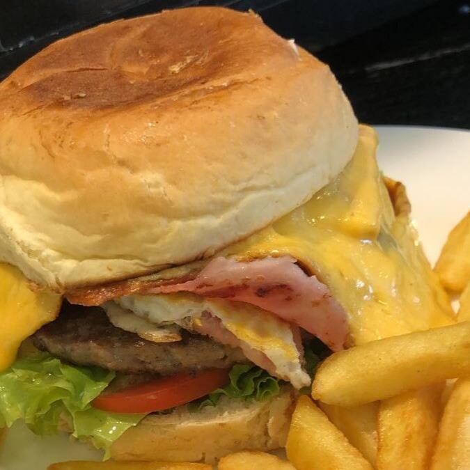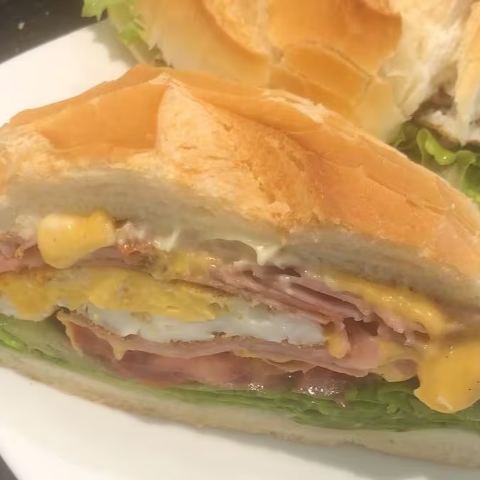 Completo e suculento! Hambúrguer de 90g, queijo prato, presunto, bacon crocante, ovo, alface fresca, tomate e maionese caseira. Acompanha porção de fritas douradas. Uma refeição clássica e satisfying.