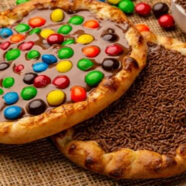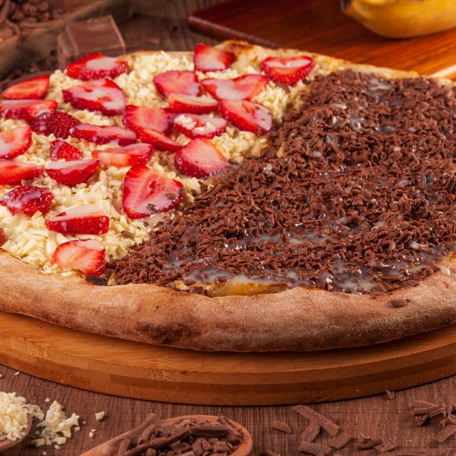 Deliciosa massa artesanal coberta com morangos suculentos e chocolate derretido, metade com banana caramelizada e leite condensado — o melhor dos dois sabores em uma combinação perfeita!