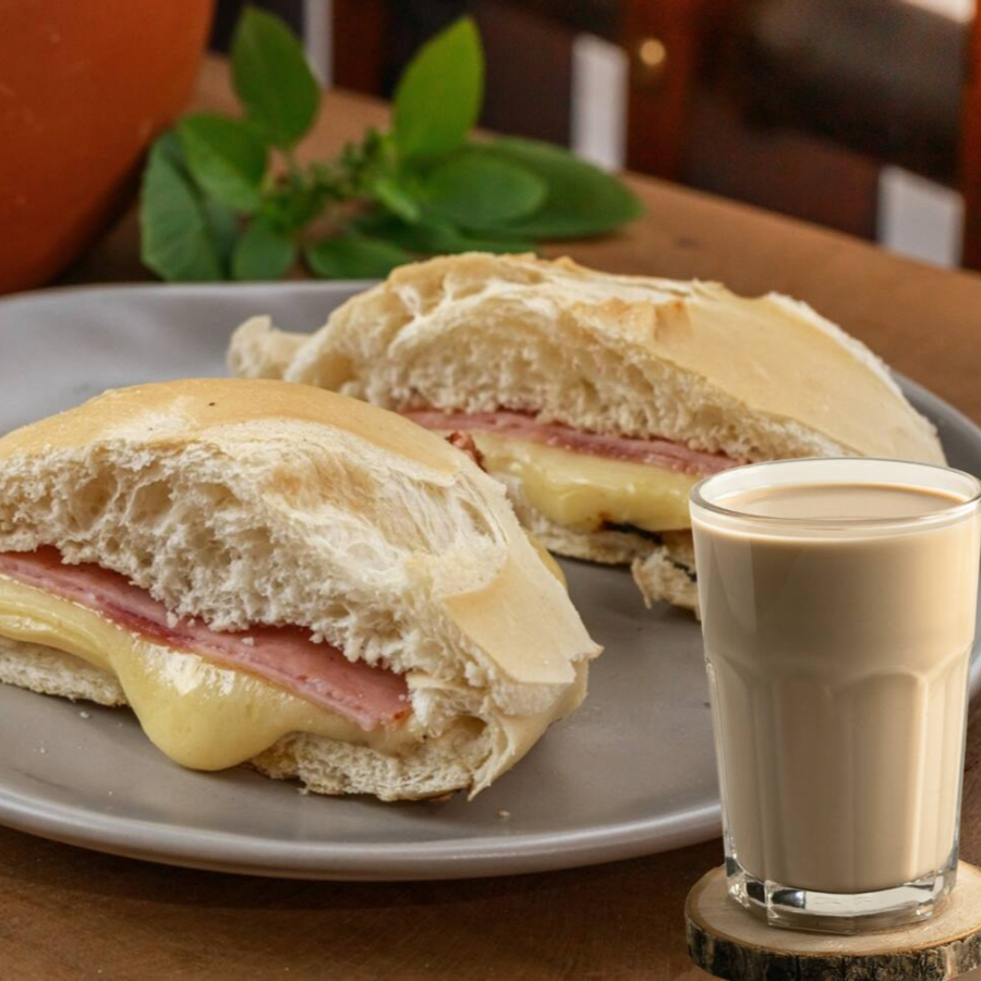 Delicioso pão francês com queijo derretido e presunto, crocante por fora e macio por dentro. Acompanha um café com leite coador (médio), preparado na hora, com aroma encorpado e sabor equilibrado – perfeito para começar o Dia com energia!