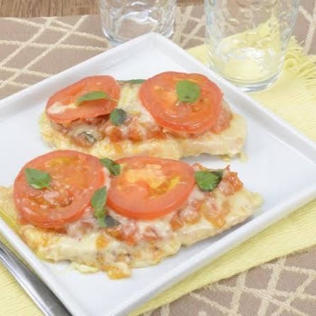 Frango grelhado, coberto com mussarela, rodelas de tomate e oregano. acompanha arroz.