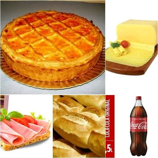 1 torta de frango, 5 pães , 150 grs de presunto, 150 grs de mussarela e 1 coca cola 1,5 lts
