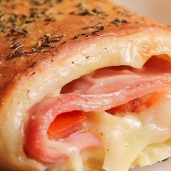 Salgado Bauru, recheado Apresuntado, Queijo Prato, fatia de Tomate e Orégano.