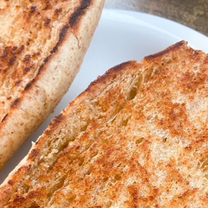 Pão integral cortado ao meio e passado na manteiga, depois prensado na chapa.