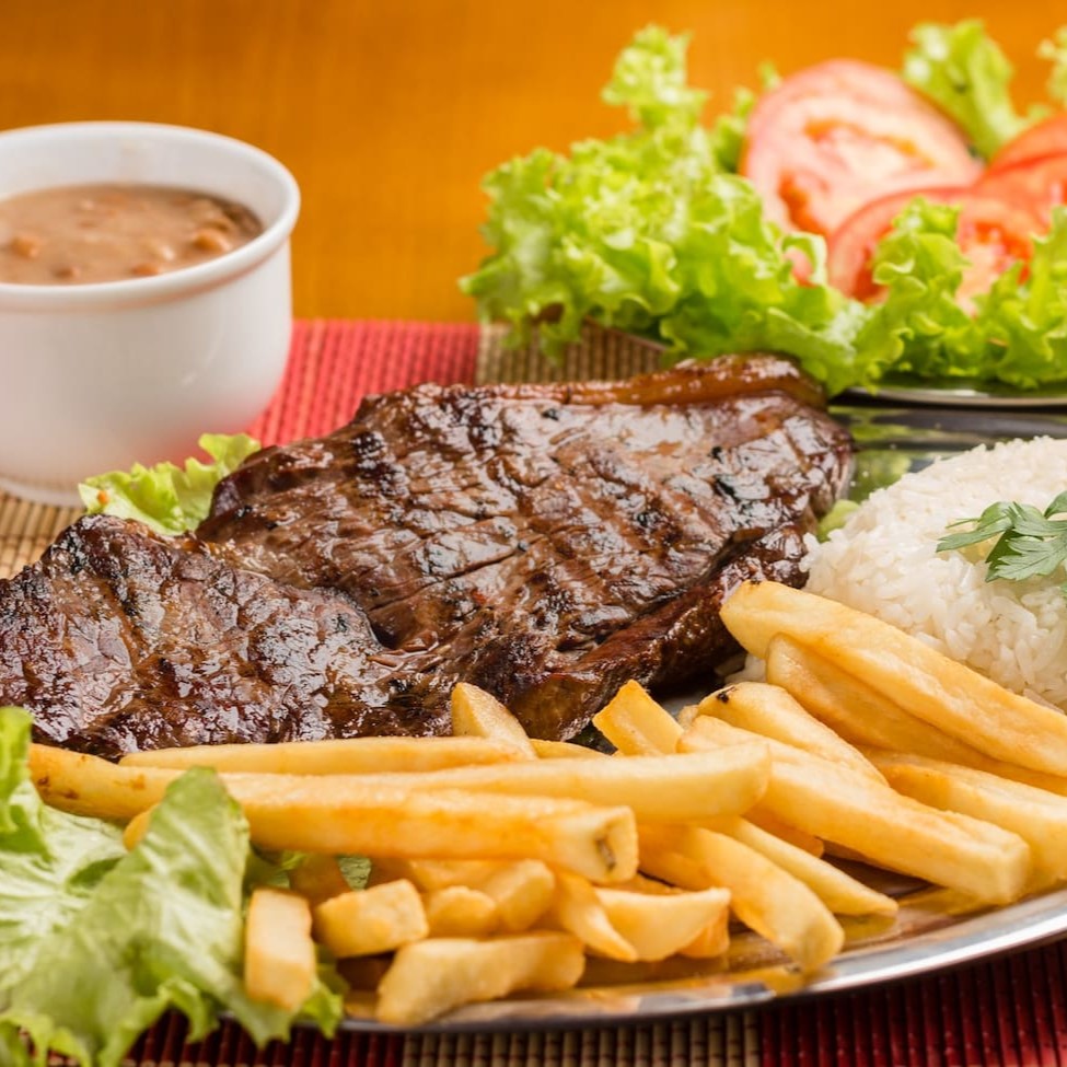 Suculento e bem temperado, servido com arroz, feijão, salada verde e fritas crocantes. Preparado na hora, sempre fresquinho e delicioso, é uma refeição completa que agrada a todos!