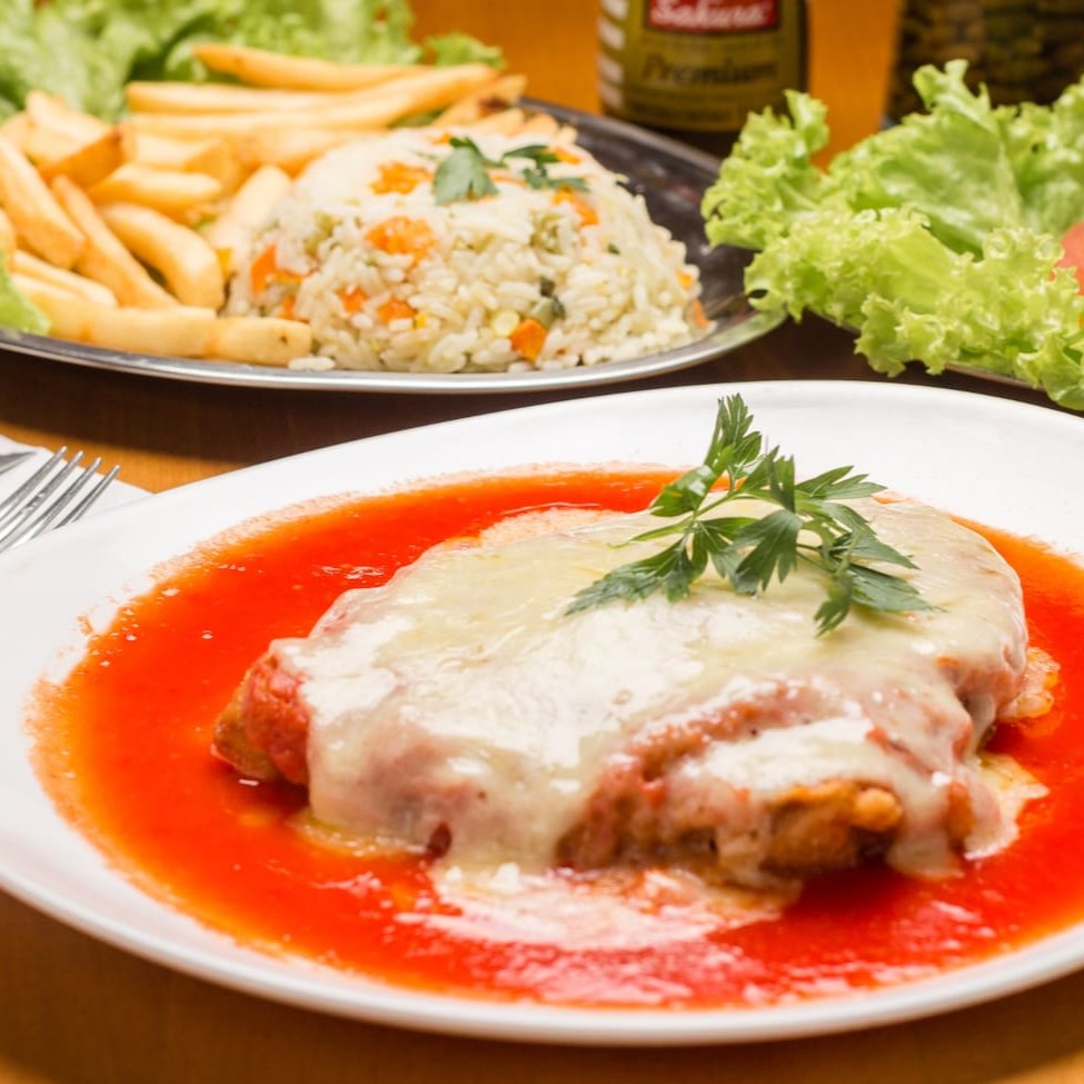 Suculento, empanado e coberto com molho de tomate e queijo derretido, servido com arroz, feijão, salada verde e fritas crocantes. Preparado na hora, sempre fresquinho e delicioso, é uma refeição que encanta!