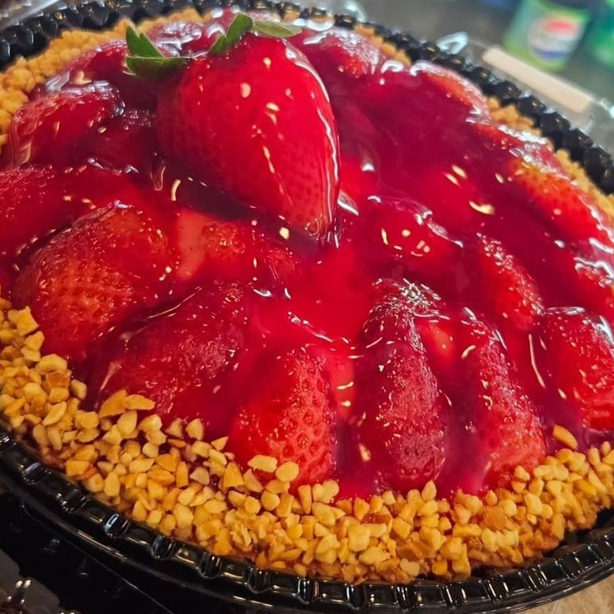 Uma deliciosa torta de morango, feita com uma massa macia e crocante, acompanhada de um creme irresistível e coberta por morangos e geléia de morango.