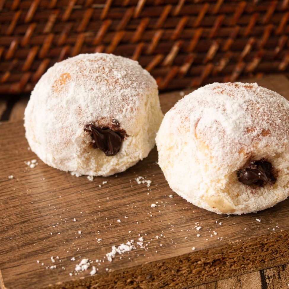 Nosso delicioso sonho frito recheado com creme e açúcar de confeiteiro por cima