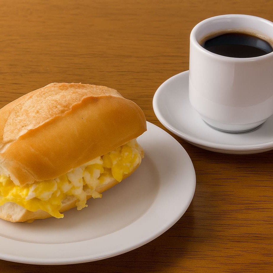 Combo com Pão Crocante por fora, macio por dentro, Recheado com ovo na medida certa, feito na hora, do jeitinho que você gosta. Acompanha café puro ou com leite. Escolha a bebida na próxma etapa ---->