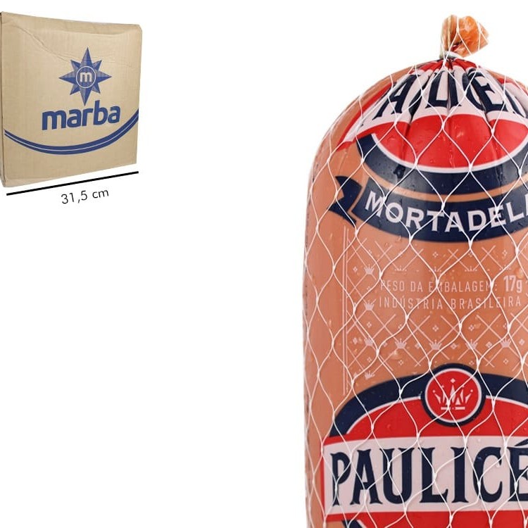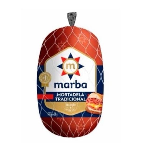 Mortadela Marba: feita com carne suína de qualidade e temperos selecionados. Textura macia e sabor característico. Popular em sanduíches e tábuas de frios.