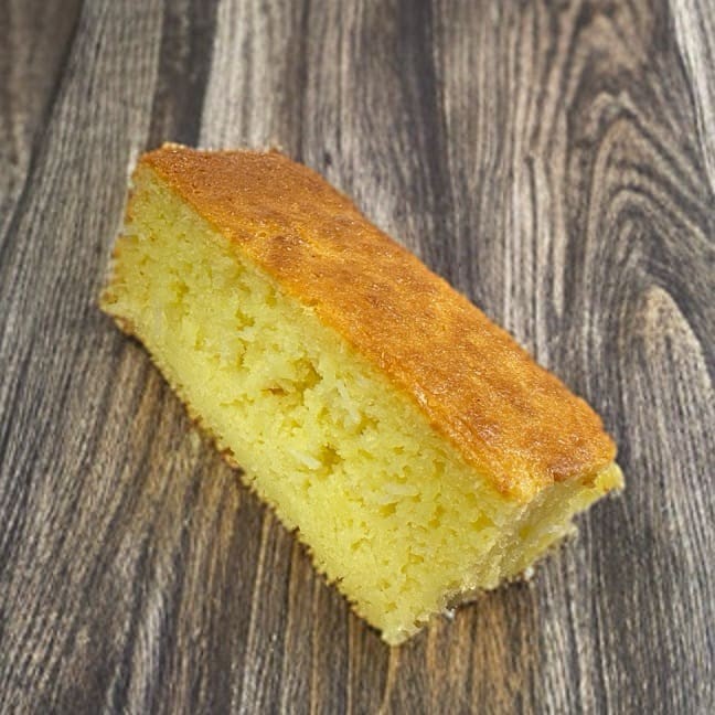 Um pedaço de bolo de mandioca é uma porção individual de um bolo denso e úmido, feito com mandioca ralada ou em purê.