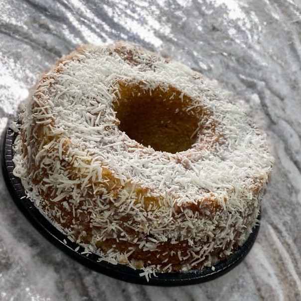 Bolo de Coco Redondo: sobremesa fofinha e saborosa, feita com massa de coco e finalizada com uma generosa cobertura de coco ralado.
