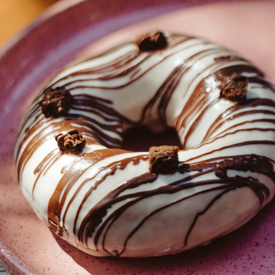 Donut ou rosquinha com cobertura de chocolate branco com chocolate preto mesclado e pedaços de cookie. Feito com 100% farinha orgânica. INGREDIENTES: Farinha de trigo orgânica refinada, fermento biológico, água, açúcar demerara orgânico, óleo de girassol, chocolate branco (açúcar, manteiga de cacau, gordura vegetal,maltodextrina e polidextrose). Contém emulsificante lecitina de girassol e aromatizante vanilina), cookie de cacau feito de farinha de trigo refinada orgânica, açúcar demerara,açúcar mascavo, fermento químico, cacau em pó, óleo de girassol. CONTÉM GLÚTEN. ALÉRGICOS: CONTÉM TRIGO. PODE CONTER AVEIA , AVELÃS, AMENDOIM, AMÊNDOA, CASTANHA DE CAJU, SOJA e PISTACHE