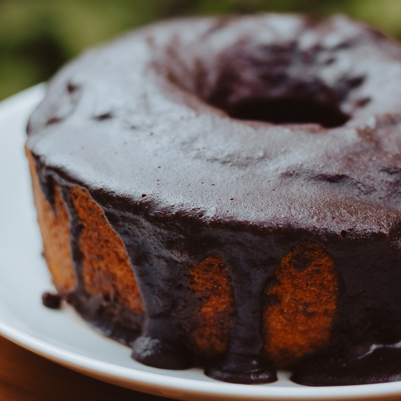 Bolo de vó, daqueles com furo no meio, massa branca com granulado e cobertura de ganache de chocolate preto. INGREDIENTES: Farinha de trigo refinada orgânica, açúcar refinado, água, chocolate granulado (Açúcar, gordura vegetal, amido de milho, cacau em pó, glicose líquida, emulsificante lecitina de soja, glaceante e espessante goma arábica).Açúcar, gordura vegetal, glicose em pó, cacau em pó, amido de milho (Bacillus thuringiensis, Streptomyces viridochromogenes, Agrobacterium tumefaciens, Zea mays, Sphingobium herbicidorovans, Dicossoma sp., Diabrótica firgifera, Thermoccocales spp., Bacillus substilis), sal, emulsificantes lecitina de soja (INS 322) e mono e diglicerídeos de ácidos graxos (INS 471), umectante glicerol (INS 422), glaceante talco (INS 553iii), espessante goma arábica (INS 414) e extrato de cacau.), fermento químico, óleo de girassol CONTÉM GLÚTEN. ALÉRGICOS: CONTÉM TRIGO, CONTÉM DERIVADOS DE SOJA e PISTACHE.