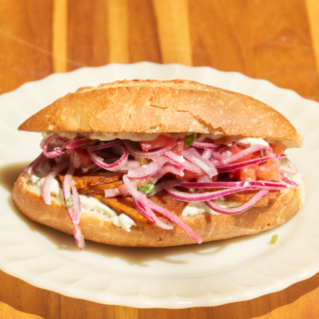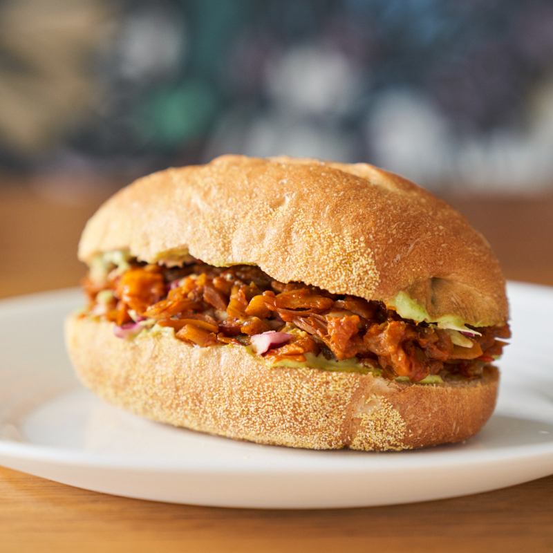 Carne de jaca com molho defumado, vinagrete de repolho e maionese da casa no nosso pão francês. Aproximadamente 240g INGREDIENTES: Farinha de trigo refinada orgânica, fermento biológico seco, glúten de trigo, água, sal, açúcar demerara, óleo de girassol e Azeite extra virgem. Maionese Verde (Inhame, tofu, água , óleo girassol, bolinha, limão, sal, salsa ), alho, cebola, jaca desfiada, pimentão vermelho, pimentão amarelo, pimentão verde, páprica defumada, azeite, molho de tomate, lemmon pepper, sal, azeite, vinagre. Repolho roxo. CONTÉM GLÚTEN. ALÉRGICOS CONTÉM TRIGO E DERIVADOS DE SOJA. PODE CONTER AVEIA , AMENDOIM, AMÊNDOA , AVELÃS E CASTANHA DE CAJU, PISTACHE.