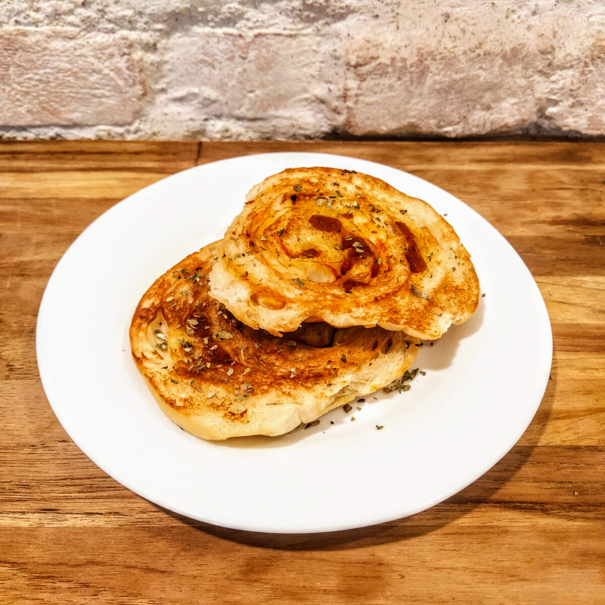 Nosso roll na versão "salgada", recheado com molho de tomate, queijo de castanha de caju e orégano na chapa com manteiga de macadâmia. Aproximadamente 90g. CONTÉM GLÚTEN. ALÉRGICOS CONTÉM TRIGO, CASTANHA DE CAJU E MACADÂMIA. PODE CONTER AVEIA, AMENDOIM, AMÊNDOA, SOJA. E PISTACHE