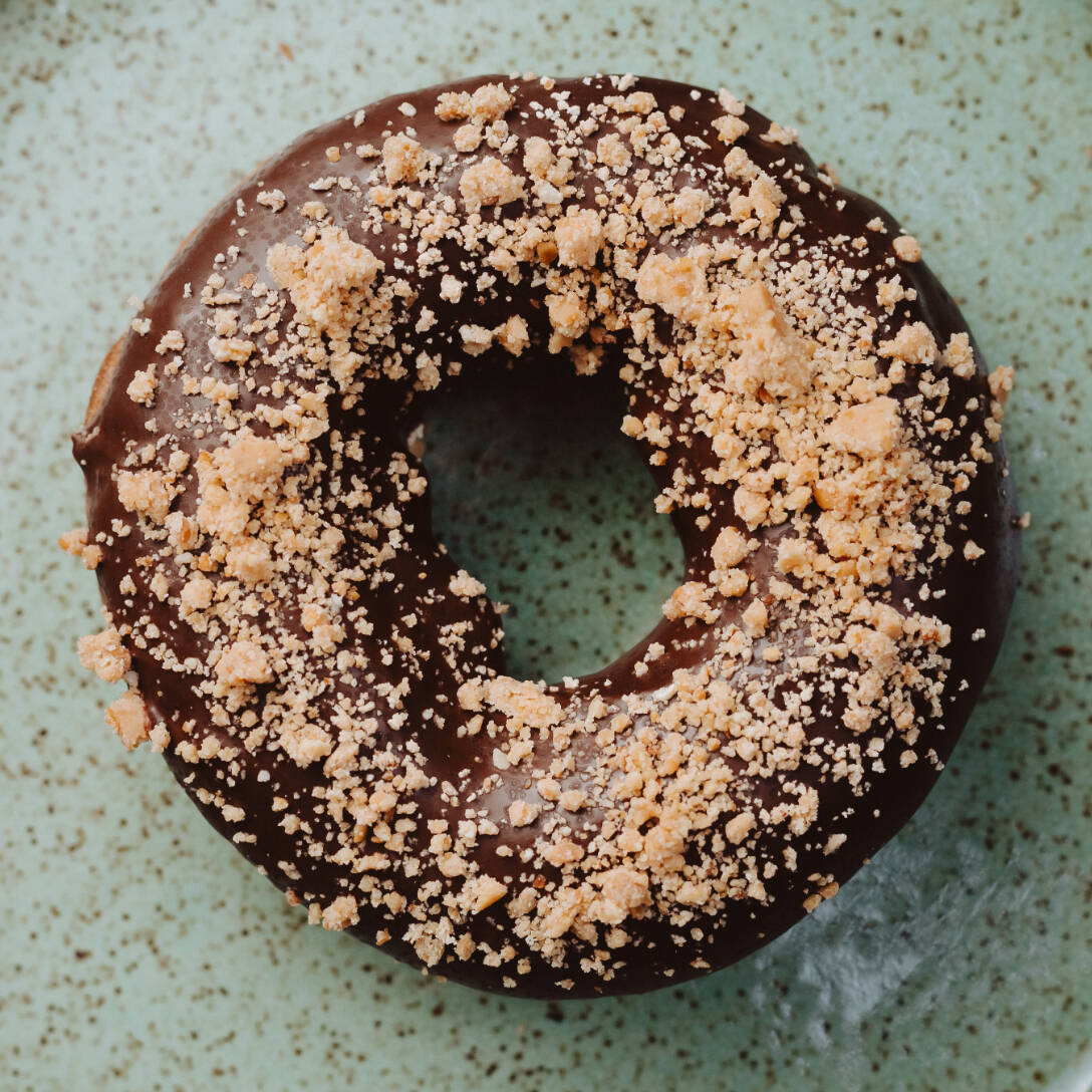 Donut ou rosquinha com cobertura de chocolate preto com paçoca. Feito com 100% farinha orgânica. INGREDIENTES: Farinha de trigo orgânica refinada, fermento biológico, água, açúcar demerara orgânico, óleo de girassol, chocolate 56% cacau tnuva, (massa de cacau, açúcar, manteiga de cacau, lecitina de girassol, aromatizante vanilina e estabilizante PGPR) e paçoca. CONTÉM GLÚTEN. ALÉRGICOS: CONTÉM TRIGO, CONTÉM AMENDOIM.PODE CONTER AVEIA , AVELÃS, AMÊNDOA, CASTANHA DE CAJU, SOJA PISTACHE