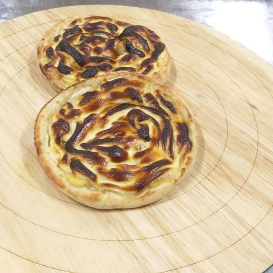 Esfiha de banana, canela, açúcar e chocolate branco.