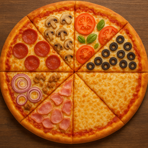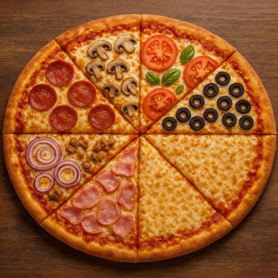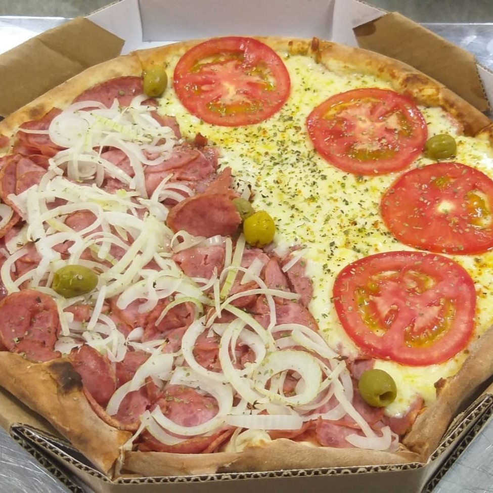 Meia Calabresa acebolada, Meia Mussarela com rodelas de tomates, azeitonas e orégano.