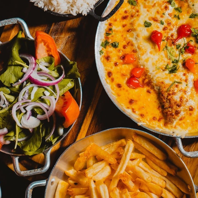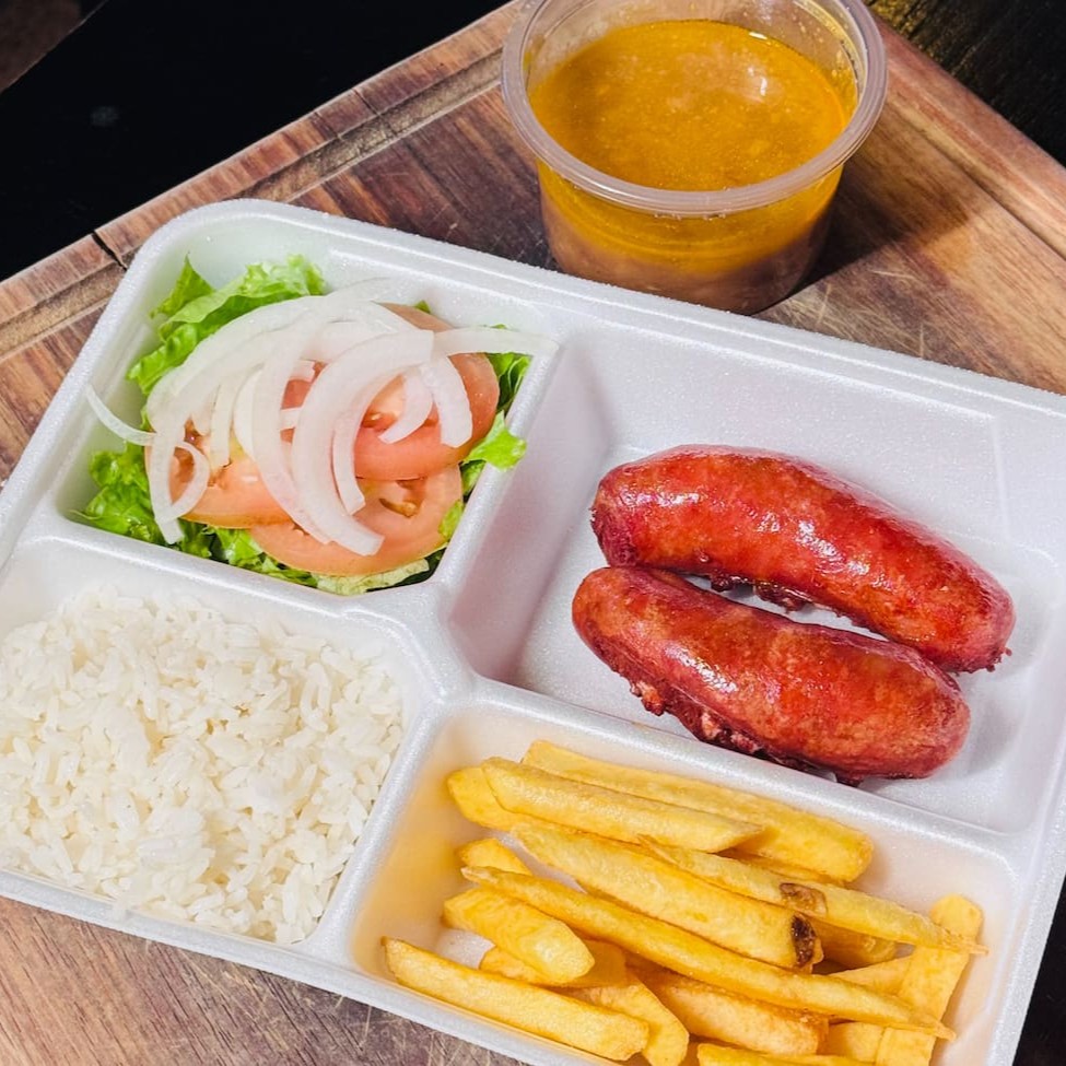 Novidade no paladar brasileiro, tiras de carnes, tiras de frango e linguiça. nosso famosos arroz biro biro, farofa da casa, feijão e vinagrete. (nao contem coca)
