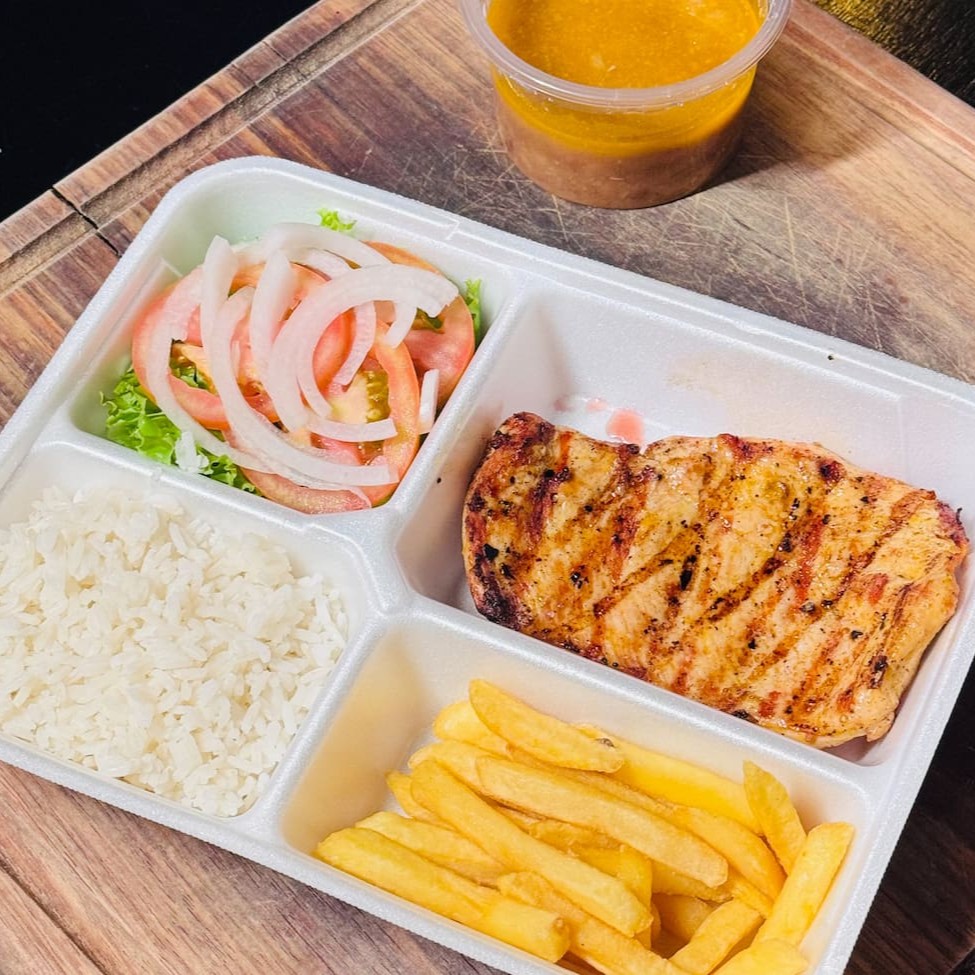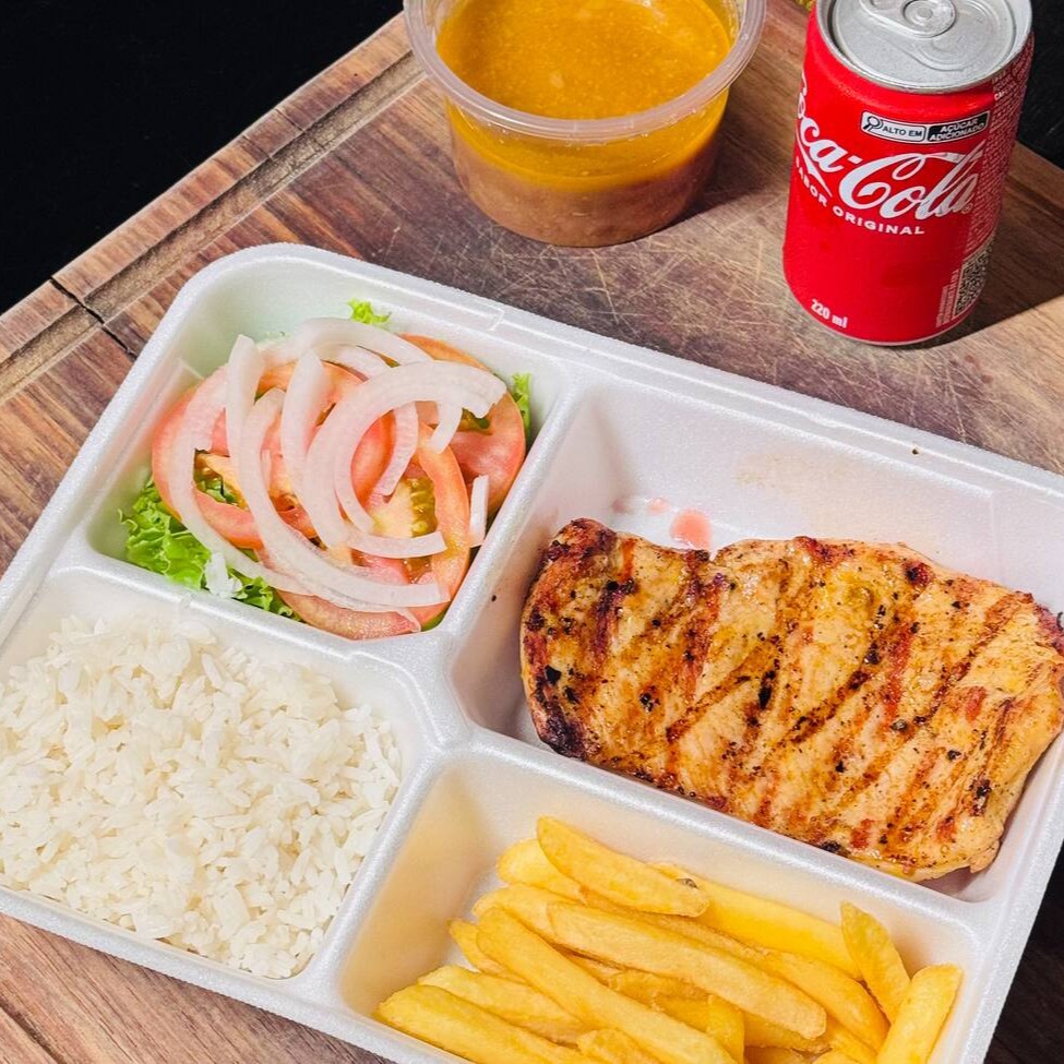 Acompanha: arroz, feijão, fritas, salada e coca cola lata