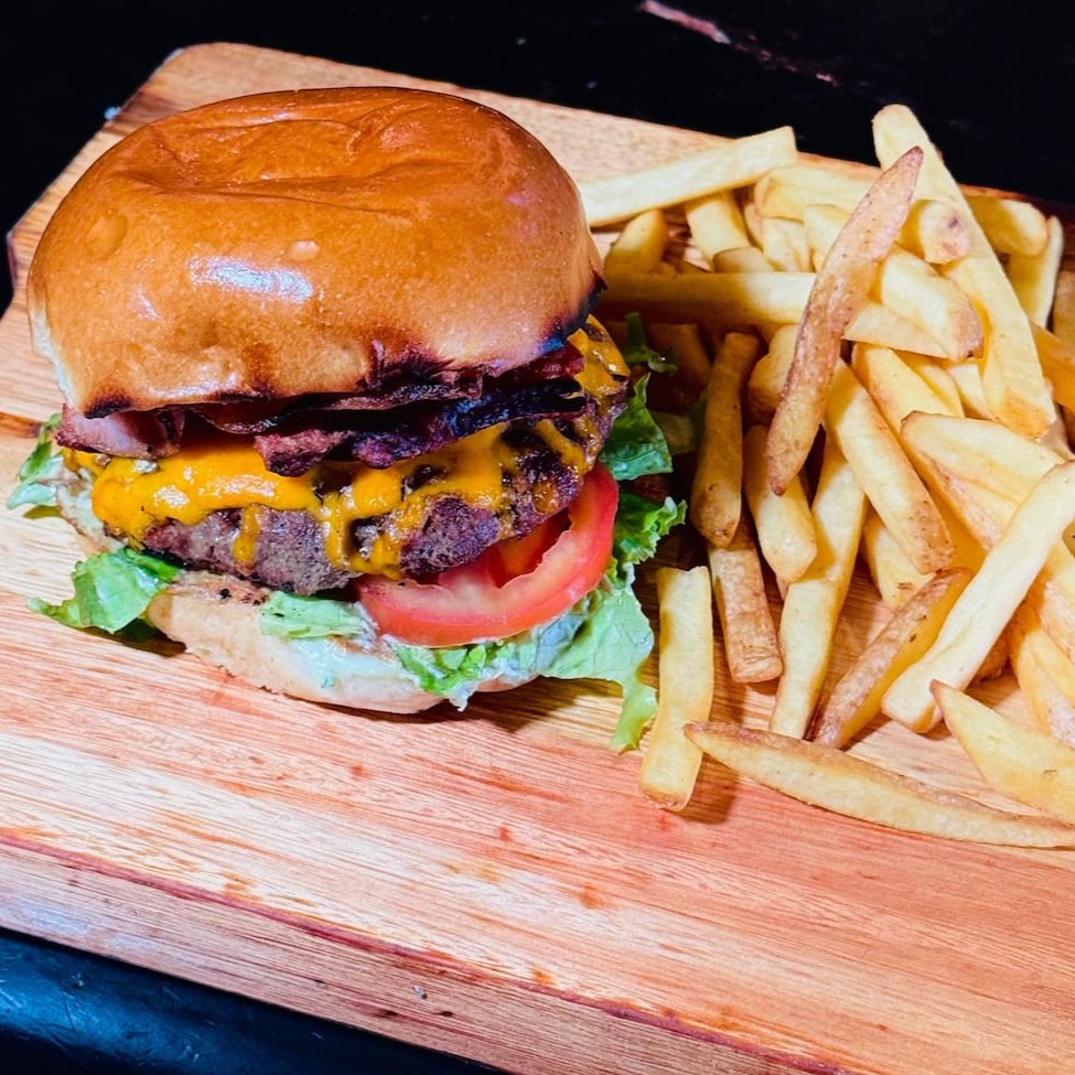 Hambúrguer, queijo prato, alface tomate, bacon defumado 647 e maionese da casa. Acompanha fritas